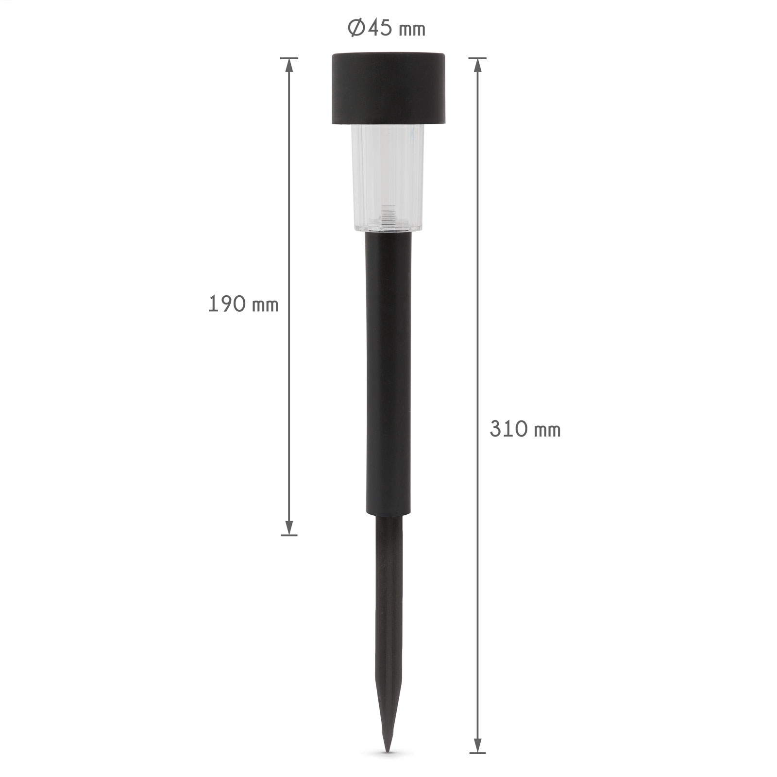 Fényforrás: LED LED-ek száma: 1 db LED színe: Hideg fehér Szolár panel: 30 x 30 mm, 2 V, 10 mA Energiaforrás: 1.2V Ni-Mh akkumulátor Akkumulátor kapacitás: 40 mAh Működési idő: 6 - 8 óra Méret: 300 x Ø 45 mm Leszúrótüske hossza: 110 mm Anyag: Műanyag Súlya: ~60 g